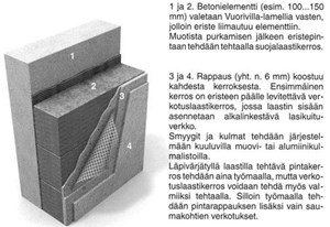 1. Jos käytetään lamellivillaa (vuorivilla, jossa kuidut ovat kohtisuorassa julkisivua vastaan) lämmöneristeenä niin järjestelmä perustuu eri rakennekerrosten väliseen tartuntaan. Sisäkuori valetaan muottiin asennettua lämmöneristettä vasten, jolloin eriste kiinnittyy betoniin sementtiliimalla ja betoni tunkeutuu osittain eristeen sisään. Mekaanisia kiinnikkeitä käytetään vain yli 20 m korkeudessa olevissa julkisivun osissa varmistamaan kestävyys tuulen imua vastaan. Asentaminen muottipintaa vasten takaa suoran rappausalustan ja oikomisten tarve jää vähäiseksi.