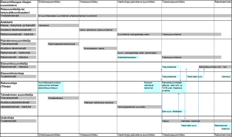 Kustakin elementtikauppamallista on laadittu tarkempi prosessikaavio ja aikataulumalli aikataulutuksen tueksi. Tukiaineistossa on esitetty rakennuksen suunnittelun tehtäviä hyvin yleisellä tasolla kuitenkin erotellen elementtisuunnittelu omaksi tehtäväkseen. Kaavioita luetaan vasemmalta oikealta. Hankkeen eri vaiheet on eroteltu katkoviivoin. Kunkin suunnittelijan ja toimijan alla on esitetty eri vaiheiden tietomallien nimet. Näin suunnittelun tehtäviä voidaan lähestyä kussakin vaiheessa laadittavan tietomallin kautta. Vaaleammalla taustalla on esitetty muita rungon suunnitteluun oleellisesti liittyviä tehtäviä. Prosessin oleellisimpia elementtisuunnitteluun vaikuttavia tietovirtoja on kuvattu nuolilla. Kaavioissa ei ole esitetty toteumamalleja.